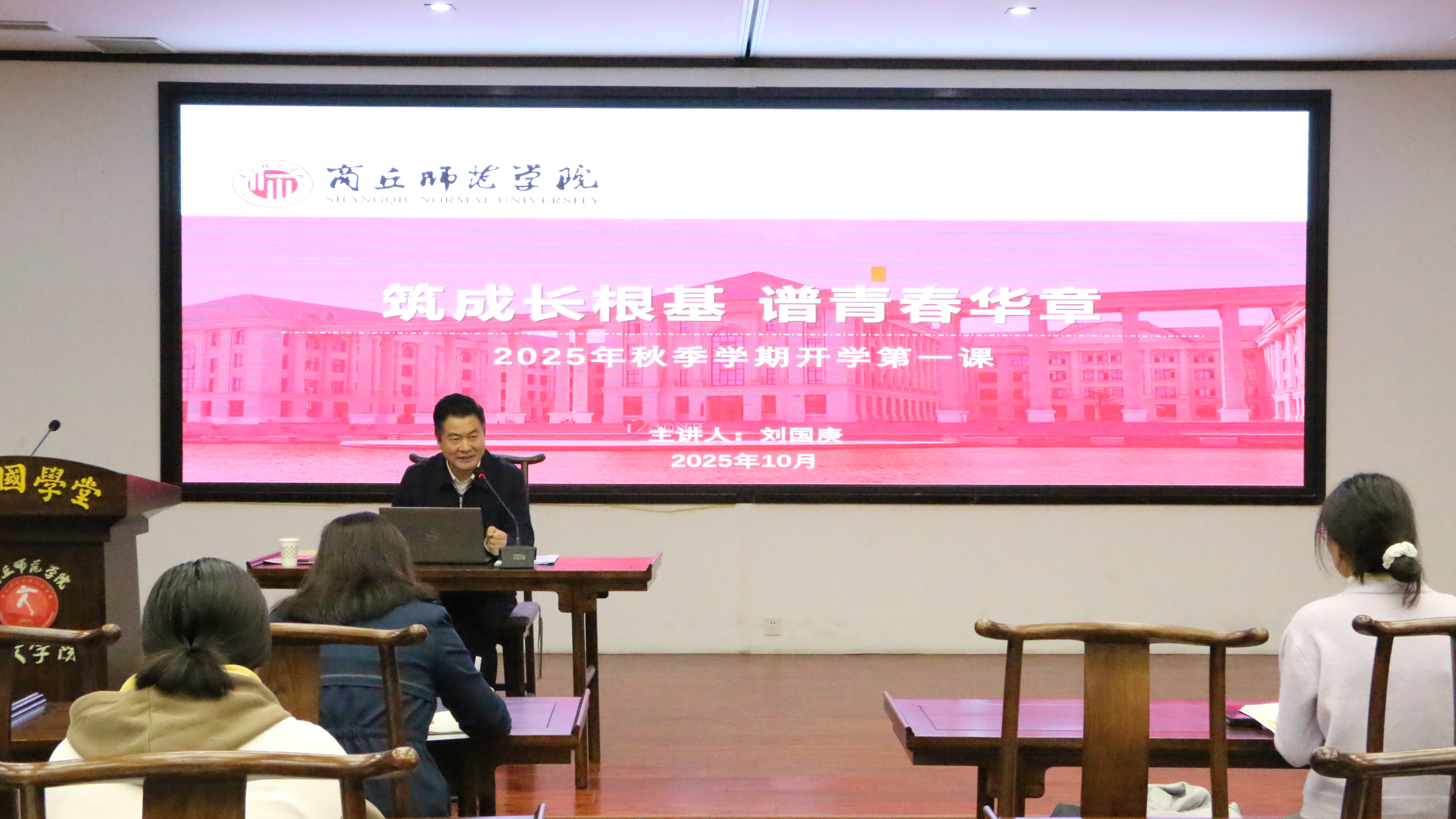 10月10日晚,校党委副书记、工会主席刘国庚在梁园校区应天国学堂以《筑成长根基谱青春华章》为题,为买球官方网站2025级全体新生讲授了一堂内容丰富、思想深刻、富有感染力的思政课。