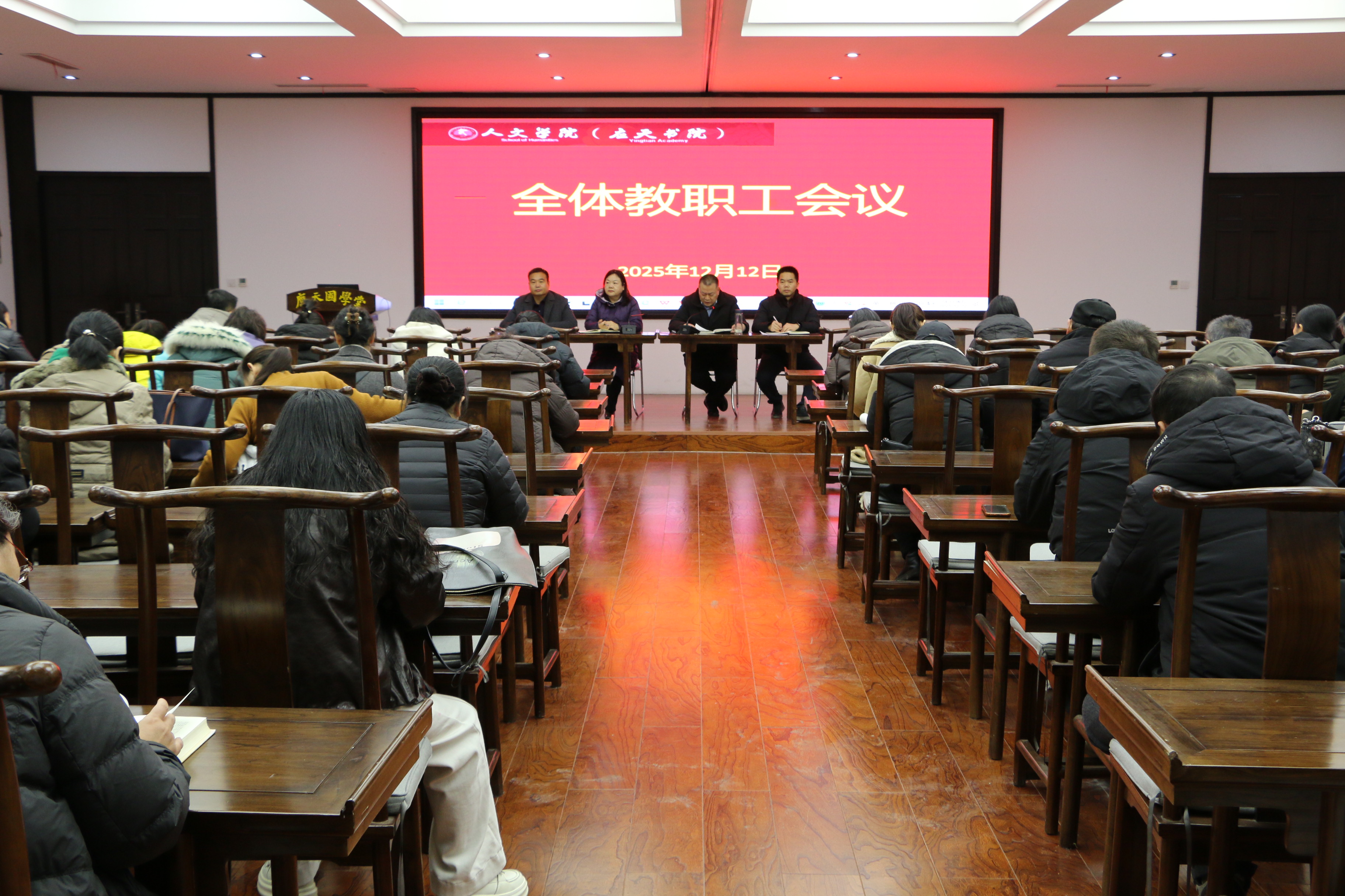 12月12日下午,买球官方网站在汉梁楼国学堂召开全体教职工大会,传达学习学校会议精神,部署重点工作。会议由学院党委书记陈晓明主持。