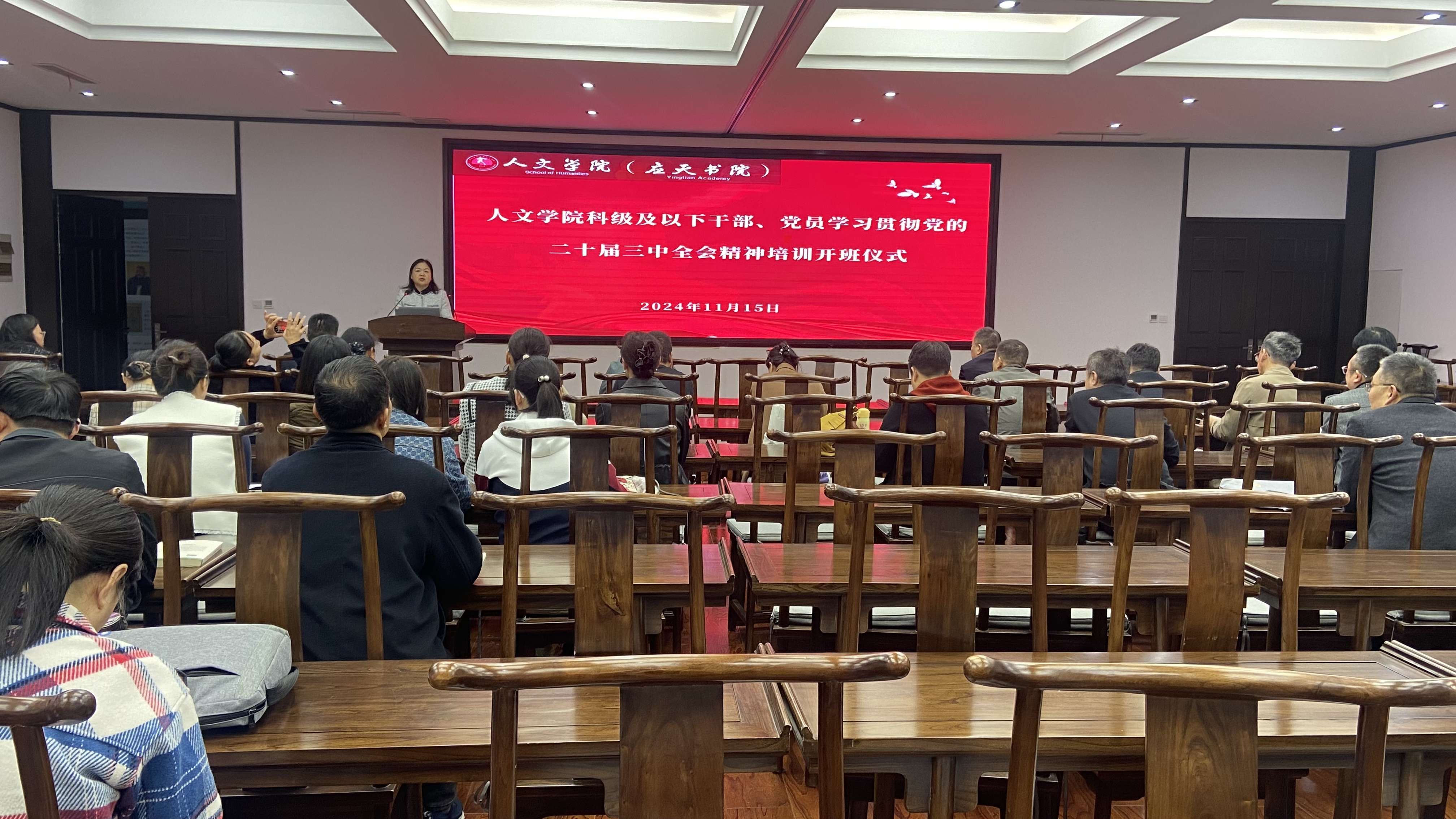 11月15日下午,买球官方网站在国学堂举行了科级及以下干部、党员学习贯彻党的二十届三中全会精神培训开班仪式。此次培训旨在深入学习贯彻党的二十届三中全会精神,切实提升学院科级及以下干部、党员的政治理论素养和工作实践能力,为推动学院高质量发展提供坚实的思想保障。开班仪式由学院党委书记陈晓明主持,学院全体科级及以下干部、党员参加会议。